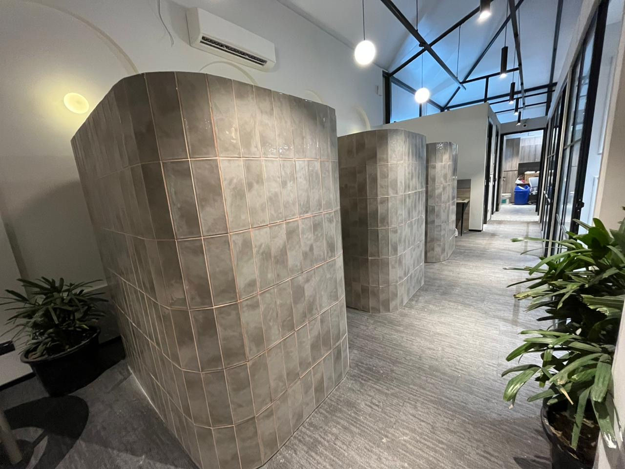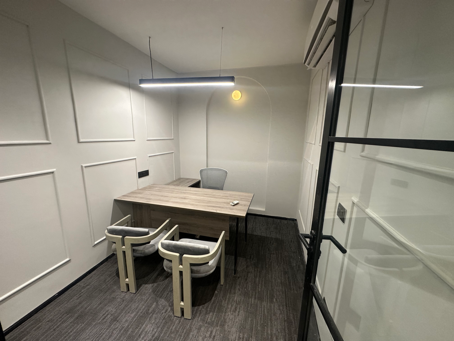 Reception and waiting areas were styled with marble flooring, ambient cove lighting, and digital touchpoints. Discussion pods used curved glass partitions and warm-tone wood finishes. Scale models and branding walls were positioned for direct visibility from the entrance.